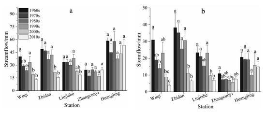 We tested differences in the mean values between different periods for LFCs and FCs by using ANOVA (analysis of variance). Significant differences were found in the decadal mean values of streamflow and stormflow in the LFCs before and after 2000, which is consistent with Figure 3. The mean decreased by an average of 50% after 2000, compared to that before 2000 (Figure 5a,b). Compared to the streamflow in the LFCs, there were no significant differences in mean values between different periods observed for the streamflow for either of the Zhangcunyi or Huangling catchment, as evidenced by p-values greater than 0.05 (Figure 5a). In addition, there were no significant differences in mean values between each period observed for the stormflow and baseflow for the Huangling catchment (Figure 5b,c). This indicates that the FCs with a history of 150 years and mature and stable vegetation structures have stable hydrological regimes. These changes again illustrated the variability and stability in these catchments.