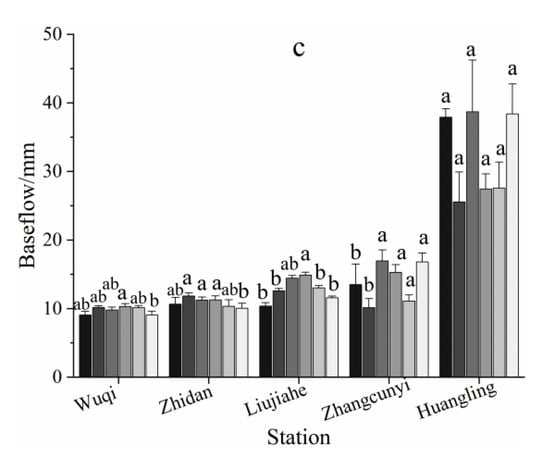 Baseflow is the main recharge source of river runoff, and it is important to use a stable and reliable baseflow segmentation method to analyze the time-series variation in baseflow characteristics for water resources planning and ecological protection. Although the baseflow segmentation by the BFI method is relatively reliable [,], the baseflow formation process is affected by many factors such as climate, soil, and geology, and the baseflow results cannot be verified by accurate monitoring data, which leads to some uncertainty in the baseflow segmentation results and thus brings uncertainty to the analytical results of the paper.