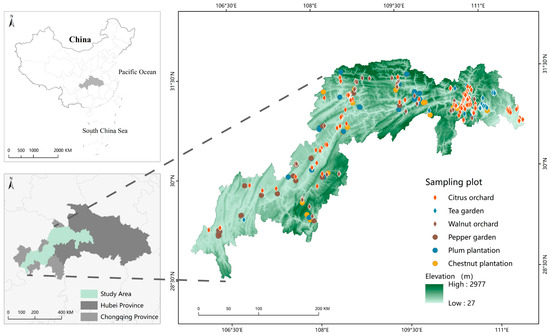 The Three Gorges Reservoir Area (28°56′–31°44′ N, 106°16′–111°28′ E) lies at the end of the upper reaches of the Yangtze River, where Three Gorges Dam, the world’s largest dam, was constructed. It spans 20 counties of Chongqing and Hubei, with an area of 10,000 km2 (Figure 1). This area is characterized by karst mountains and hills. The distribution of water and heat conditions is spatially and temporally uneven due to topographical heterogeneity. The climate is subjected to subtropical monsoons, with hot and rainy summers and mild and humid winters. The annual mean temperature ranges from 17 to 19 °C, while the annual precipitation is 1000–1025 mm [4]. The primary zonal soils are Vertisols, Cambisols, Calcisols, and Gleysols [30]. There are multiple vegetation types along elevation altitudes, including evergreen broadleaved forest, mixed broadleaved forest, deciduous broadleaved forest, evergreen coniferous forest, shrub, and grassland along altitude gradients. Since this hilly area has limited capability for growing crops, the government has actively enforced the afforestation and reforestation project as NTPP was planted widely in the area to address ecological challenges and promote economic development [1,31]. The dominant types of NTPP in the region include citrus orchards, tea gardens, walnut orchards, pepper gardens, plum plantations, and chestnut plantations [5]. Citrus was widely planted, accounting for 18.9% of the local planted area. Other plantations were sporadically distributed in the areas close to croplands and residence places.