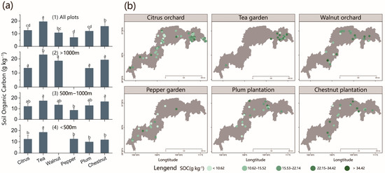 Three altitude gradients were observed from the NTPP sampling plots, including low altitude (<500 m asl.), medium altitude (500–1000 m asl.), and high altitude (>1000 m asl.), since these plantations were planted within a certain altitude range. In fact, these plantations were thoughtfully managed from the beginning of afforestation and reforestation project in TGRA. The spatial distribution of SOC in NTPP was depicted in Figure 2a, where the topsoil SOC increased with the rising altitude for citrus orchards, tea plantations, plum plantations, and chestnut plantations. Among all types of plantations, tea plantations had the highest SOC (18.54 ± 7.25 g kg−1), followed by chestnut plantations (15.58 ± 9.53 g kg−1), while pepper plantations had the lowest SOC (11.28 ± 4.82 g kg−1). SOC in the citrus orchard was at a moderate level and remained relatively constant across these altitude gradients. Walnut orchards were only found at mid to high altitudes, while pepper plantations were only grown at low to mid altitudes.