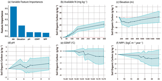 Feature importance of significant variables in SOC modeling and the corresponding partial dependence plots. Panel (a) shows the feature importance of significant variables in SOC modeling based on Random Forest. Panels (b–f) depict the partial dependence of SOC on available nitrogen (AN), elevation, soil pH, growing season mean temperature (GSMT), and net primary productivity (NPP), respectively.