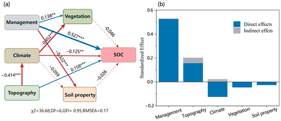 In SEM, the path coefficient (β) measures the direct or indirect association between two individual variables. A larger β value indicates a stronger relationship between the variables. SEM results were presented with quantified contributions of significant variables (Figure 4a). The best developed model presented the smallest χ2 value at 36.68 and the largest CFI value at 0.95. The contributions of integrated management (as AN), topography (as elevation), climate (as GSMT), vegetation (as NPP), and soil property (as pH) are depicted in Figure 4. Consistent with RF modeling results, SEM showed a strong positive relationship between the management and SOC content in the topsoil. Three types of variables (management, topography, and climate) exhibited both direct and indirect effects on the SOC content (Figure 4b). The management had the strongest total effects on the SOC content (β = 0.527), followed by the topography index (β = 0.158) and climate (β = −0.125). Management had negative effects on SOC through vegetation (β = −0.046) and soil properties (β = −0.026), but the overall effect remained positive. The topography had positive effects on SOC, which were counterbalanced by climate (β = −0.414), leading to a relatively strong negative indirect effect on SOC (β = −0.125). The negative effects of high temperature on SOC were consistently observed in both direct and indirect ways.