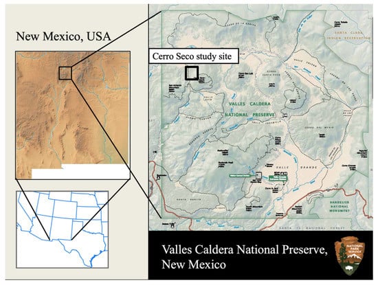 Location of the Cerro Seco study site within Valles Caldera National Preserve and New Mexico, USA.