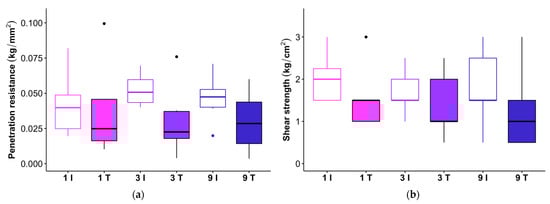 (a) Soil surface resistance to penetration as measured with a pocket penetrometer (each observation is the mean of three replicate readings). (b) Shear strength as measured by TORVANE. Open boxplots show data from between the feller buncher tracks (I = intertrack), and filled boxplots show data from the tracks (T). Pink, purple, and blue represent one, three, and nine passes, respectively. The horizontal line within each box represents the median for that treatment, and the lower and upper bounds of the box indicate the 25th and 75th percentiles. Whiskers extend to 1.5× the interquartile range (IQR) from the lower and upper box bounds. Outlier observations more extreme than 1.5× the IQR are plotted as dots.