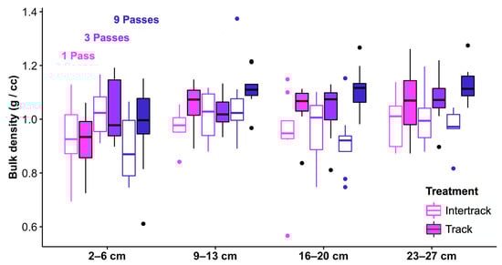 Soil bulk densities (g/cm3) from four depths beneath the track and intertrack sampling locations that received 1, 3, or 9 passes (pink, blue and purple, respectively) from a feller buncher. Open boxplots show data from between the feller buncher tracks, and filled boxplots show data from the tracks. The horizontal line within each box represents the median for that treatment, and the lower and upper bounds of the box indicate the 25th and 75th percentiles, respectively. Whiskers extend to 1.5× the interquartile range from the lower and upper box bounds, and outlier observations are plotted as individual dots.
