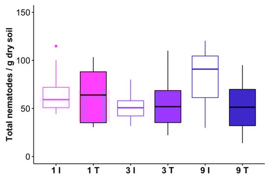 Total nematode abundances in track (T) and intertrack (I) transect areas which received 1, 3, or 9 passes from the feller buncher. One outlier observation is not shown (276 nematodes/g dry soil in a 9 pass intertrack sample). The horizontal line within each box represents the treatment median, and the lower and upper bounds of the box indicate the 25th and 75th percentiles, respectively. Whiskers extend to 1.5× the interquartile range from the lower and upper box bounds. Outlier observations are represented as dots.