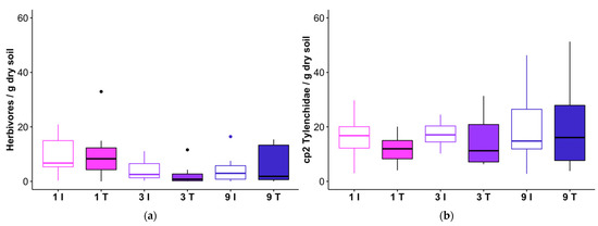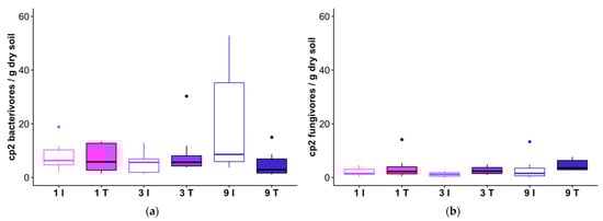 Abundances of cp2 bacterivores (a) and cp2 fungivores (b) in track (T) and intertrack (I) transect areas which received 1, 3, or 9 passes from the feller buncher. The horizontal line within each box represents the median for that treatment combination, and the 25th and 75th percentiles for each treatment combination are delineated by the lower and upper bounds of the boxes, respectively. Whiskers extend to 1.5× the interquartile range.