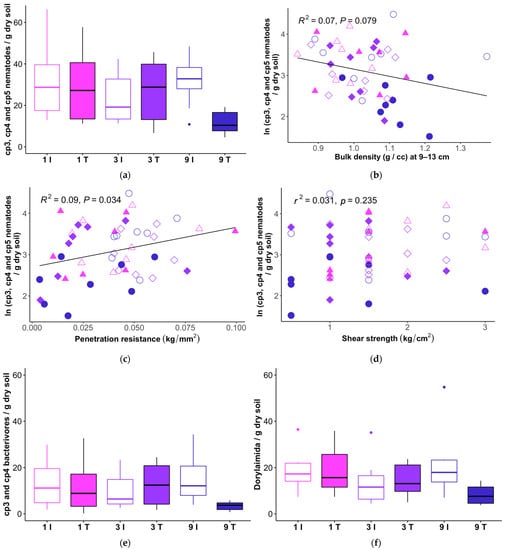 Total abundances of cp3, cp4, and cp5 nematodes in feller buncher tracks (T) that received one, three, or nine passes, and matched intertrack (I) sampling locations (a); and correlations between total cp3, cp4, and cp5 nematodes and (b) bulk density at 9–12 cm, (c) surface penetration resistance, and (d) soil shear stress. (e) Harvester disturbance treatment responses of total cp3 and cp4 bacterivores. (f) Responses of Dorylaimida to harvester traffic. The horizontal line within each box represents the median for that treatment, and the lower and upper bounds of the box indicate the 25th and 75th percentiles, respectively. Whiskers extend to 1.5× the interquartile range from the lower and upper box bounds. Outlier observations are plotted as dots.