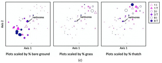 Abundances of (a) herbivore nematodes and (b) nematodes in the family Tylenchidae (one observation of 174 Tylenchidae/g dry soil in a 9-intertrack treatment is not shown). The horizontal line within each box represents the median for that treatment, and the lower and upper bounds of the box indicate the 25th and 75th percentiles, respectively. Whiskers extend to 1.5× the interquartile range from the lower and upper box bounds, and outliers are plotted as dots. (c) Non-metric multidimensional scaling (NMDS) ordination of ground cover, performed using Bray-Curtis distance, with points scaled according to percent bare ground, grass, and thatch (senesced grass) cover, respectively (larger points indicate greater cover by the category indicated below each panel; treatment means and standard errors for each cover class are listed in Table 4). Herbivore abundance is shown as a vector overlay, indicating the relationship of herbivores with plot ground cover dissimilarity along axes 1 and 2 of the three-dimensional NMDS ordination. The direction of the line away from the center point indicates the direction of the association. I = intertrack, T = track; 1, 3, and 9 refer to a number of feller buncher passes received.