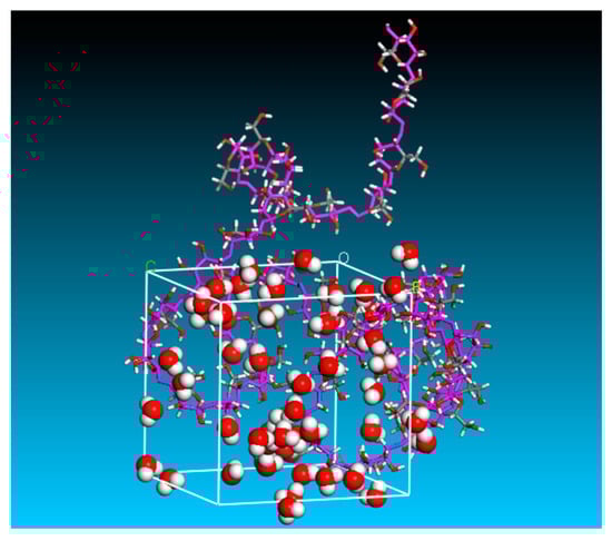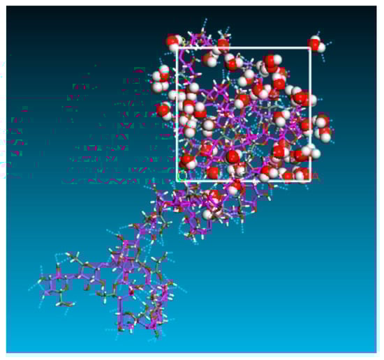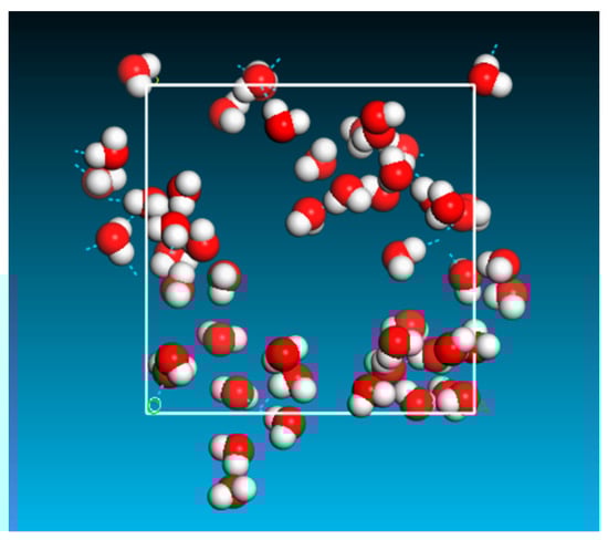 The molecular dynamics simulation software in this paper is Materials Studio (2019, BIOVIA, San Diego, CA, USA), a PC-ready simulation software developed specifically for researchers in materials science. Before building the overall cellulose amorphous region-water model, the water molecule model and the cellulose chain need to be built separately. First, create a 3D document, click the Sketch Ring button on the sketch toolbar, and select Oxygen from the optional elements displayed. Click on the Adjust Hydrogen button to automatically add the correct number of hydrogen atoms to the model. Click on the Clean button to adjust the position of the model atoms so that bond lengths, bond angles, and torques are displayed appropriately. The structure of the cellulose chain is complex and can be drawn using the method for building amorphous polymers or by downloading the desired model from the materials project. Cellulose is composed of -D-glucopyranosyl (dehydrated glucose) with a simple molecular formula of (C6H10O5)n, where n is the degree of polymerization. The physicochemical properties of cellulose are not affected by changes in the degree of polymerization [35], so the degree of polymerization of cellulose chains established in this paper is 20. Calculations were performed with Amorphous cells to create a cellulose amorphous region-water model, which consists of 52 water molecules and a cellulose chain. The density of the model was set to 1.5 g/cm3 [36], and the final model was created with a box size of 20.5 × 20.5 × 20.5 Å3. Figure 1 shows the cellulose amorphous region-water model with atoms in the model using the CPK color scheme, which was proposed and improved by Corey, Pauling, and Koltun, the designers of the CPK model. The gray, white, and red colors represent carbon, hydrogen, and oxygen atoms, respectively. To facilitate the distinction, cellulose chains are shown in stick mode, while water molecules are shown in ball and stick mode.