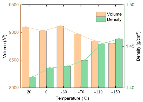 At each temperature, the model was simulated in 1 ns steps, and the model parameters for each frame were summed and averaged to obtain the data in Table 2. From Table 2, it can be seen that the length, width, and height of the models decreased from 20.88 Å to 20.65 Å from 20 °C to −150 °C. Although there was a small increase in the length, width, and height of the models from 0 °C to −30 °C, the overall trend was decreasing. In order to observe the changes in the models at different temperatures more visually, the average values of the volume and density of each model were calculated, as shown in Figure 3.