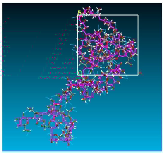 - After the system reached equilibrium and then entered into formal kinetic simulations for six sets (20 °C, 0 °C, −30 °C, −70 °C, −110 °C, and −150 °C). All six sets of simulations were performed at atmospheric pressure (0.1 MPa) and 1 ns under isothermal isobaric system synthesis (NPT). The pressure of the simulated experiments was controlled using the Berendsen method, chosen to be suitable for calculating the PCFF force field of natural polymer materials [30]. The electron summation was controlled by the Ewald method, and the van der Waals force calculation was controlled by the Atom-based method [37,38,39,40].