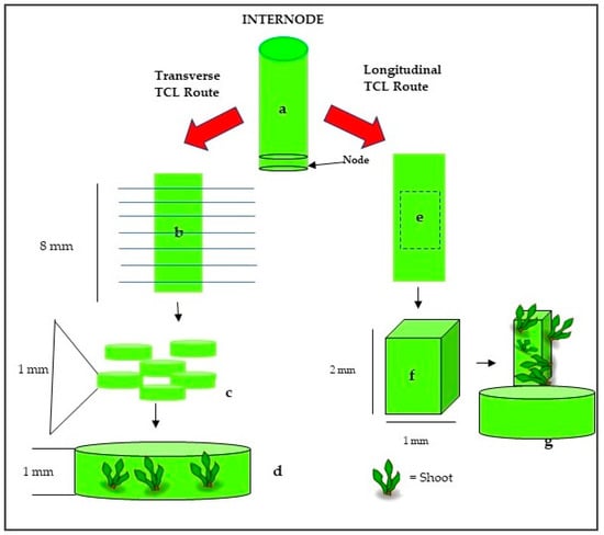 Schematic flow diagram of the preparation of a transverse thin cell layer (tTCL) or a longitudinal thin cell layer (lTCL) from a conventional explant (stem internode). (a) The donor explant is an internode. In the tTCL route (b), 1 mm thick rings are excised from the internode. (c) tTCLs should be cultured basal side or top side down on culture media. (d) Shoots will form on the tTCL explant. For the lTCL route (e), cut out a rectangular explant 2 mm × 1 mm in size along the internode surface. (f) A rectangular explant of 2 mm × 1 mm size. (g) Shoots are produced on the surface and not on the inner side of the internode. Modified after Teixeira da Silva and Dobránszki [4,5].