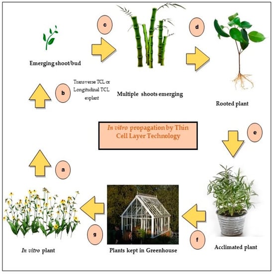 The different steps of TCL technology: (a) The explant of required size is excised from the mother plant and cultured on the MS medium. (b) A cytokinin combination is added to the MS medium to promote organ or somatic embryo development. (c) After several days, the plant is transferred to an elongation medium to grow several elongated shoots. (d) As the shoots grow, the plantlets are transferred to a root-induction medium. (e) The rooted plantlets are planted in a pot of garden soil for acclimatization. (f) The acclimatized plantlets are transferred to a greenhouse for further hardening. (g) In vitro plants are grown for further analysis.