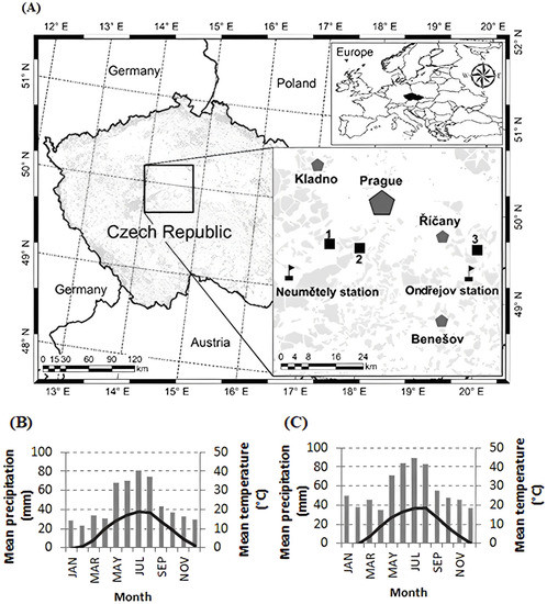For the research locations of Karlstejn and Cukrak, climate data were taken from the Neumetely meteorological station (49°51′00′′ N, 14°02′24′′ E). The meteorological station has an altitude of 322 m a.s.l. and is situated about 16 km from the Karlstejn plot and approximately 25 km from the Cukrak plot.