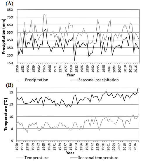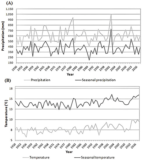 The average annual temperature is 8–9 °C, precipitation is around 560 mm [21], and the average growing season is about 165 days [18] (Figure 2). The climate varies from slightly warm to slightly dry, whereas winter can be considered mild; the maximum precipitation is in the summer (July) and the minimum in the winter months [17].
