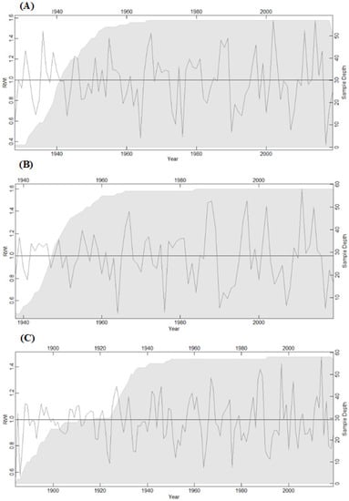 Characterization of RWI and sample depth for the entire chronology for the location of Karlstejn (A), Cukrak (B), and Kostelec (C).