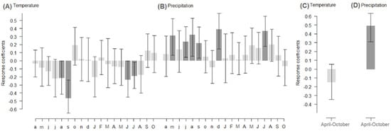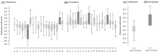 Response coefficients function for Karlstejn for the period 1950–2018 (from April of the precedent year to October of the current year). (A): average monthly temperatures (B): average monthly precipitation. (C): Summary response coefficients of monthly temperatures for the growing season (average value from current April to October). (D): Summary response coefficients of average monthly precipitation for the growing season (average value from current April to October). The (light/dark) gray bars describe response value with black lines that represent the 95% confidence interval. Values marked in dark gray are statistically significant (p < 0.05).
