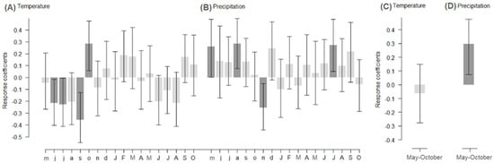 Response coefficients function for Kostelec for the period 1950–2018 (from May to October). (A): average monthly temperatures (B): average monthly precipitation. (C): Summary response coefficients of monthly temperatures for the growing season (average value from current May to October). (D): Summary response coefficients of average monthly precipitation for the growing season (average value from current May to October). The (light/dark) gray bars describe response value with black lines that represent the 95% confidence interval. Values marked in dark gray are statistically significant (p < 0.05).