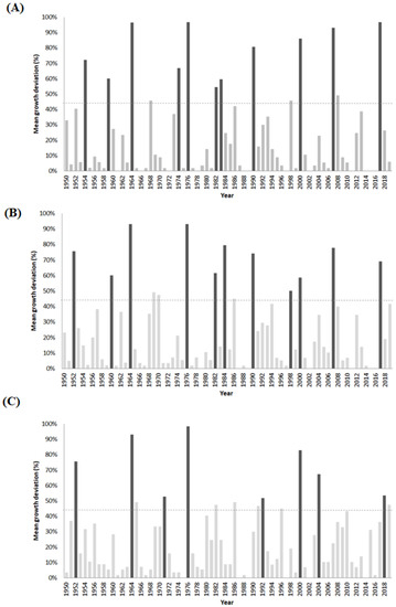 Finally, we have calculated negative pointer years with the WEISER program [33] to estimate the influence of extreme weather events on diameter increments. For every tree, the negative event years were considered as extreme narrow ring widths that were 75% or less compared with the average ring width values in the precedent seven years [34]. A negative pointer year occurs when an event year is specified for at least 50% of the trees in the plot.