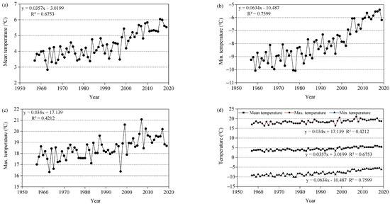 Climatic change trend in the Three-River Headwaters Region of the Tibetan Plateau from 1957 to 2019. (a) Mean temperature, Monthly mean temperature; (b) Min. temperature, Monthly mean minimum temperature; (c) Max. temperature, Monthly mean maximum temperature; (d) Temperature, Monthly mean maximum, mean, and minimum temperature; (e) Precipitation, Total annual precipitation; (f) Relative humidity, Monthly mean relative humidity.