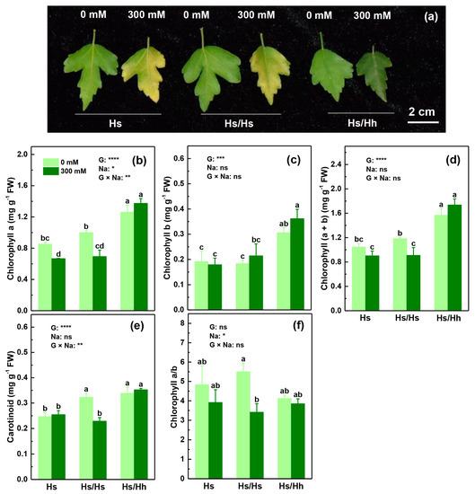 Morphology (a), and concentrations of chlorophyll a (b), chlorophyll b (c), chlorophyll (a + b) (d), carotenoid (e), and chlorophyll a/b (f) of grafted H. syriacus leaves grown under either 0 (control) or 300 mM NaCl conditions. Hs: self-rooted H. syriacus; Hs/Hs: self-grafted H. syriacus; Hs/Hh: heterografted H. syriacus with H. hamabo as the rootstock. Data indicate means ± SE (n = 6). Different letters on the bars indicate significant differences between the treatments. p-values based on the ANOVA tests for grafting (G), NaCl (Na), and their interaction (G × Na) are indicated: * p < 0.05; ** p < 0.01; *** p < 0.001; **** p < 0.0001; ns: not significant.