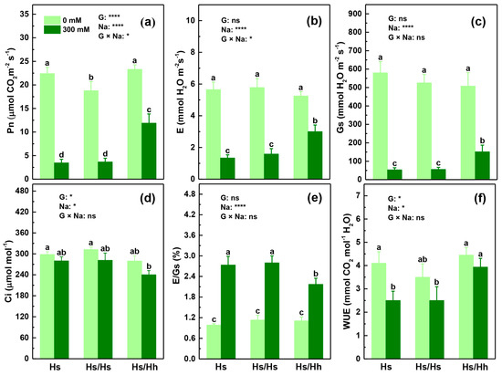 (a) Net photosynthetic rate (Pn), (b) transpiration rate (E), (c) stomatal conductance (Gs), (d) intercellular CO2 concentration (Ci), (e) E/Gs, and (f) photosynthetic water-use efficiency (WUE) of grafted H. syriacus leaves grown under either 0 (control) or 300 mM NaCl conditions. Hs: self-rooted H. syriacus; Hs/Hs: self-grafted H. syriacus; Hs/Hh: heterografted H. syriacus with H. hamabo as the rootstock. Data indicate means ± SE (n = 6). The information about the treatments and statistical analysis is the same as that mentioned in Figure 1.