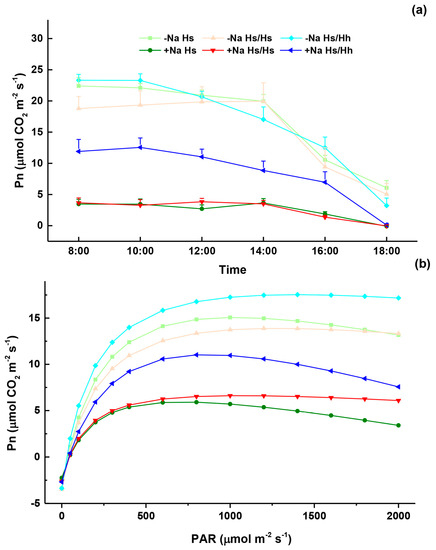 Diurnal variation of photosynthesis (a) and light-response curves (b) of grafted H. syriacus leaves grown under either 0 (−Na, serving as the control) or 300 mM NaCl (+Na) conditions. Hs: self-rooted H. syriacus; Hs/Hs: self-grafted H. syriacus; Hs/Hh: heterografted H. syriacus with H. hamabo as the rootstock. In (a), bars indicate means ± SE (n = 6); in (b), numbers represent the averages of six biological replicates.