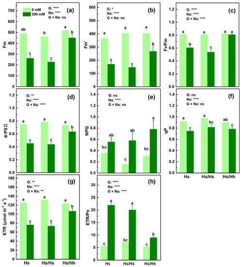 Fm (a), Fm’ (b), Fv/Fm (c), ΦPSII (d), NPQ (e), qP (f), ETR (g), and ETR/Pn (h) of grafted H. syriacus leaves grown under either 0 (control) or 300 mM NaCl conditions. Hs: self-rooted H. syriacus; Hs/Hs: self-grafted H. syriacus; Hs/Hh: heterografted H. syriacus with H. hamabo as the rootstock. Data indicate means ± SE (n = 6). The information about the treatments and statistical analysis is the same as that mentioned in Figure 1.