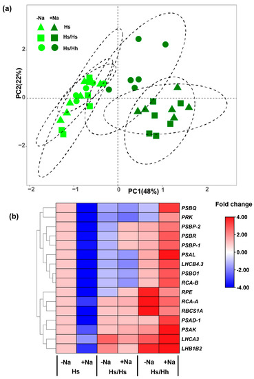 Principal component analysis (PCA) plots of photosynthetic parameters (a), cluster analysis of transcriptional fold changes of photosynthetic genes (b) of grafted H. syriacus leaves grown under either 0 (−Na, serving as control) or 300 mM NaCl (+Na) conditions. Hs: self-rooted H. syriacus; Hs/Hs: self-grafted H. syriacus; Hs/Hh: heterografted H. syriacus with H. hamabo as the rootstock.