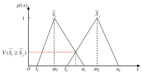 The triangular fuzzy numbers used here belong to a special class of the L–R fuzzy sets [33]. They are often expressed as , where l, m, and u are real numbers satisfying l > 0 and . Any real number in the interval is characterized by a grade of membership between 0 and 1, and its membership function is piecewise continuous, and linear. For a positive triangular fuzzy number x, the following conditions are satisfied: