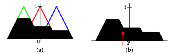 The defuzzification methods that are often discussed in the literature are: MoM (the mean of maximum method) [38], CoS (the center of sums), the dominance measure method [39], the α-cut [39], etc.