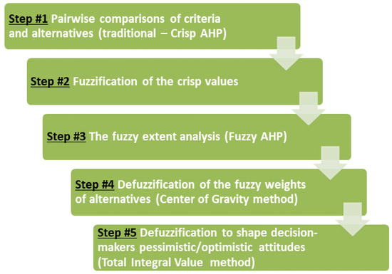 FAHP techniques can be categorized in many different ways. If the developing aspect of the FAHP model is considered, fuzzy extent analysis is an efficient way to aggregate fuzzy sets with weights of decision elements at every hierarchy level and synthesize fuzzified priorities accordingly, following standard AHP principles. Defuzzification of fuzzy weights to a crisp value at the end can be performed in several ways too, including options for modeling decision makers’ preferences and tolerance to the risks. Some of these aspects will be elaborated on in this study. A reader interested in the fuzzy extent model and various fuzzy versions of AHP should consult the pertinent literature given by [22], and many other papers referenced throughout this paper and listed at its end.