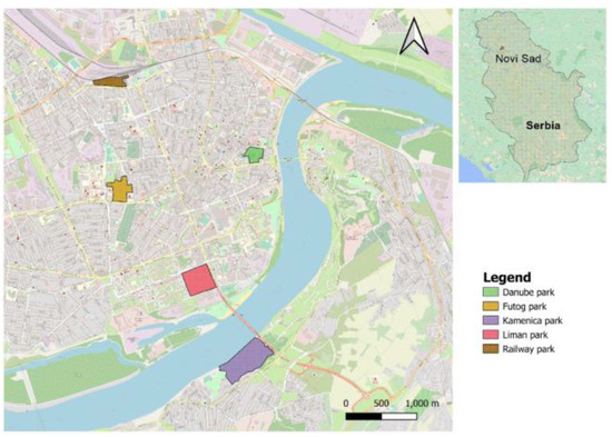 There are five major parks in Novi Sad [42,43], and they were used as a case study for our research. The locations of the parks are given in Figure 4.