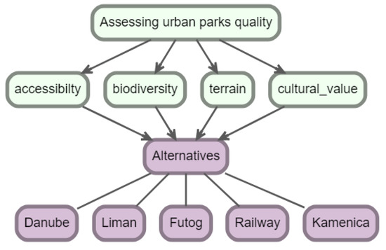 The decision elements (criteria and alternatives—urban parks) were assessed and evaluated by an experienced university professor who has performed many diverse landscape analyses. The task of this expert was to analyze the decision problem insightfully and objectively. The decision problem is based on a former study [42], where three groups of criteria are evidenced regarding aesthetic, ecological, and social perspectives. Their descriptions are provided in Table 3. The decision maker based her evaluation following the ideas from recent papers [1,44].