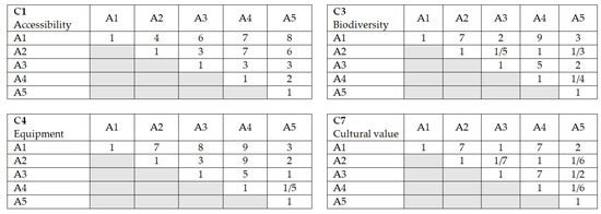 Using the same method, the expert compared the parks pairwise for each criterion, resulting in a total of 4 × ((5 × 4)/2) = 40 comparisons, as shown in Table 6. The resulting matrices were filled using the same fuzzification process as for the criteria. Two variations of the distance parameter were used again in the fuzzification process, namely, = 1 and = 2. It is important to note that the rows and columns in the matrices correspond to the parks being compared.