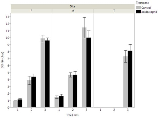 At all three sites, a series of plots were established with half the trees treated with imidacloprid and half the trees left untreated. A minimum distance of 15 m was used between plots in order to ensure no contamination of chemicals in control plots, and all trees in a plot were within approximately 30.5 m of each other. At Fishburn and Mountain Lake, 12 plots (six treated and six control) were installed in a completely randomized design with a split plot with imidacloprid treatment as the whole plot factor and tree size class as the split plot factor. The size classes used were based on the diameter at breast height (DBH) and consisted of small (<5 cm), medium (10–15 cm), and large (20–35 cm) trees with one tree of each class in each plot. At Twin Falls, 10 plots were installed (five treated and five control) and no tree size classes were used. The study design was completely randomized.