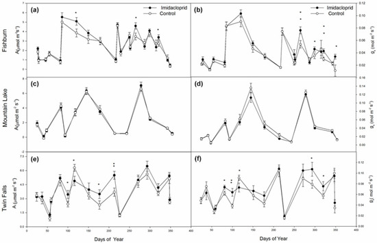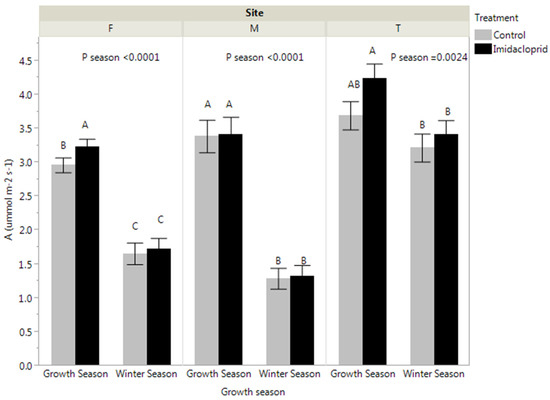 Photosynthetic rates during the growing season were 83.2 (p < 0.0001), 159.8 (p < 0.0001), and 19.7% (p = 0.0024) higher than during winter seasons at Fishburn, Mountain Lake, and Twin Falls, respectively (Figure 3). During the growing season, imidacloprid treatment significantly increased photosynthetic rates by 9.3 and 13.7% at Fishburn and Twin Falls, respectively. Nevertheless, no differences in photosynthetic rates were found between the treated group and the control group during the winter season. Although seasonal variations for photosynthetic rates were observed at Mountain Lake, there were no treatment effects during the growth season or winter season.
