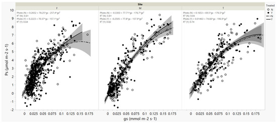 Eastern hemlock photosynthetic rates (Ps) vs. stomatal conductance (Gs) as influenced by imidacloprid treatment at Fishburn (F), Mountain Lake (M), and Twin Falls (T). Shadows indicate 95% confidence interval. N denotes control (open circle) and Y denotes imidacloprid treatment (closed circle). Treatment did not affect the intercept or the slope at α = 0.05 level.