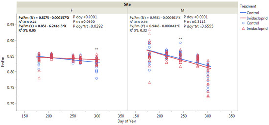Eastern hemlock chlorophyll fluorescence (Fv/Fm) as affected by imidacloprid treatment at Fishburn (F) and Mountain Lake (M). Double asterisk denotes a significant difference at α = 0.01. Blue open circle denotes control group and red open triangle denotes imidacloprid treatment.