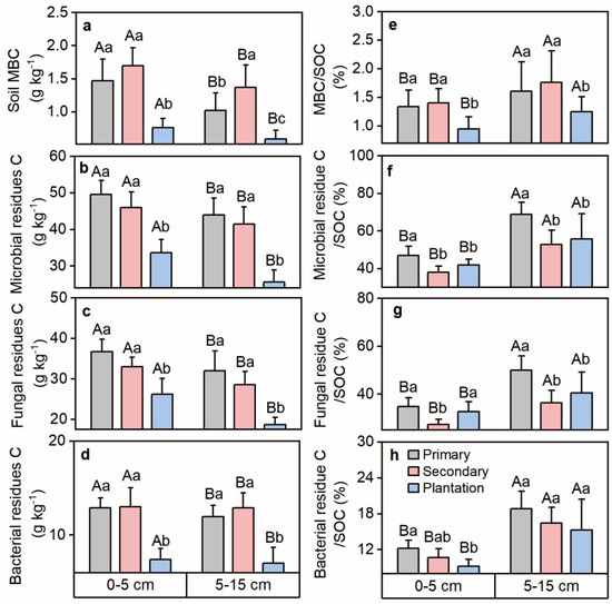 Soil MBC and microbial residue C, including fungal and bacterial residue C (a–d), and their contributions to SOC (e–h) in the three forest types. Different lowercase letters indicate significance between forest types, and different uppercase letters indicate significance between soil layers at the p < 0.05 level.