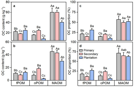 Organic C content and proportion to SOC of free POM, aggregate-occluded POM, and MAOM in the 0–5 cm (a,c) and 5–15 cm (b,d) soil layers under the three forest types. Different lowercase letters indicate significance between forest types, and different uppercase letters indicate significance between SOM fractions at the p < 0.05 level.