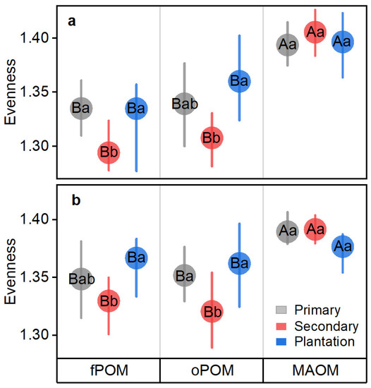 Evenness of OC chemical components in the 0–5 cm (a) and 5–15 cm (b) soil layers under the three forest types. Different lowercase letters indicate significance between forest types, and different uppercase letters indicate significance between SOM fractions at the p < 0.05 level.