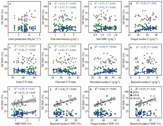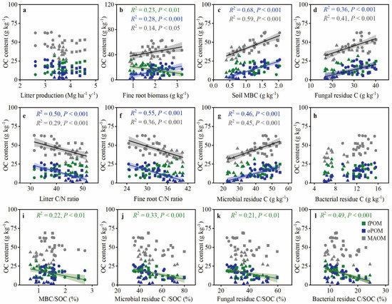 Linear relationships between the OC content of SOM fractions and litter and fine root quantity and quality, soil MBC and microbial residue C, and contributions to SOC (a–l). Squares indicate primary forests, circles indicate secondary broadleaved forests, and triangles indicate coniferous plantations. The shaded areas represent the 95% confidence intervals for the regression line.