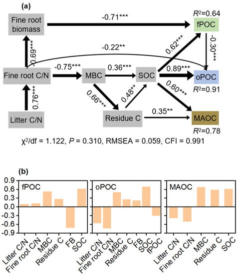 The SEM indicated that litter and fine root C/N ratios had negative impacts on fine root biomass and MBC (Figure 6a). Free POC was negatively and positively affected by fine root biomass and SOC, respectively (Figure 6a). Aggregate-occluded POC was negatively affected by the fine root C/N ratio and free POC, and positively affected by SOC (Figure 6a). MAOC was positively influenced by SOC and microbial residue C (Figure 6a). Fine root biomass, fine root C/N ratio, and MBC were most influential in controlling free POC, aggregate-occluded POC, and MAOC accumulation, respectively (Figure 6b).