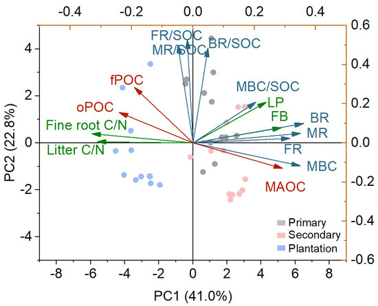 Principal component analysis (PCA) of plant properties, soil microbial properties, and chemical component evenness of SOC fractions in primary mixed forests, secondary broadleaved forests, and coniferous plantations. Numbers in parentheses represent data variations explained by the first two principal components (PCs). LP, litter production; FB, fine root biomass; MR, microbial residue C; FR, fungal residue C; BR, bacterial residue C; fPOC, free POC chemical component evenness; oPOC, aggregate−occluded POC chemical component evenness; MAOC, MAOC chemical component evenness.