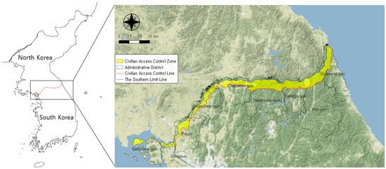 The military demarcation line (MDL) between the two countries is oriented in the east–west direction, with a total length of approximately 238 km. The parallel lines separated by 2 km to the south and north of the Military Demarcation Line are respectively called the Southern Limit Line (SLL) and the Northern Limit Line (NLL). The Demilitarized Zone (DMZ) between these two lines is a place of high historical and ecotourism value as traces of the Korean War and the ecosystem are well preserved. Approximately 5–20 km away from the SLL, there is a civilian control line (CCL). This line forms a buffer zone to the DMZ, namely, the Civilian Access Control Zone (CACZ) (Figure 1). The entrance of civilians into this area is limited (although not as extensively as with the DMZ) to protect and maintain the security of military installations and operations near the DMZ, but limited agricultural activities that do not affect military operations and security are allowed. However, many places have a high probability of landslides due to damage caused for military purposes.