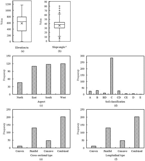 Distributions of slope condition features. (a) Elevation; (b) slope angle; (c) aspect; (d) soil classification; (e) cross-sectional type; and (f) longitudinal type. Soil classification: clay loam (A), loamy (B), loamy and weathered rock (BD), sandy loam (C), sandy and weathered rock (CD), sandy loam and soft rock (CE), weathered rock (D), and soft rock (E). The x in the box plot represents the mean of data; m, meter; °, degree.