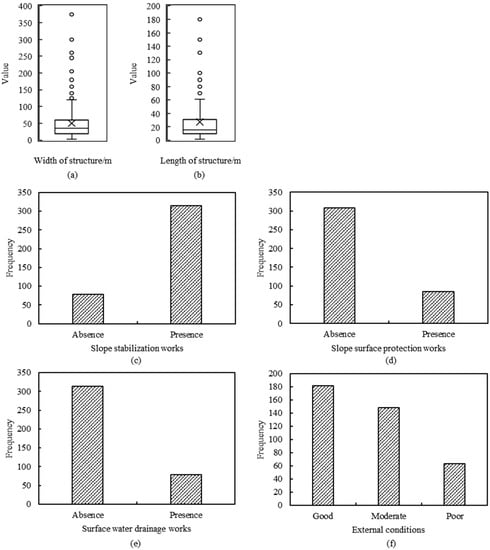Distributions of structure condition features. (a) Width of the structure; (b) length of the structure; (c) slope stabilization works; (d) slope surface protection works; (e) surface water drainage works; and (f) external conditions. The x in the box plot represents the mean of data; m, meter.