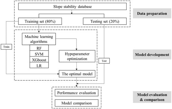 Supervised learning methods were used to simulate and predict slope stability, and four commonly used classification models were selected: random forest (RF), support vector machine (SVM), extreme gradient boosting (XGBoost), and logistic regression (LR). These were chosen for their advantages of mature theory and high efficiency [34].